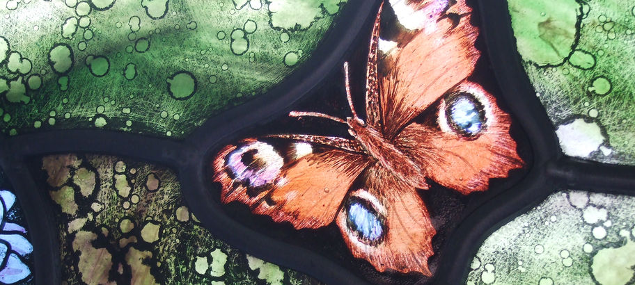 This window needed to be completely opaque due to the window looking directly onto a brick wall. The agapanthus design uses a lot of rich colours and mottled glass to achieve this. Two smaller opening windows were produced in the same style above and all were encapsulated in double glazed units.